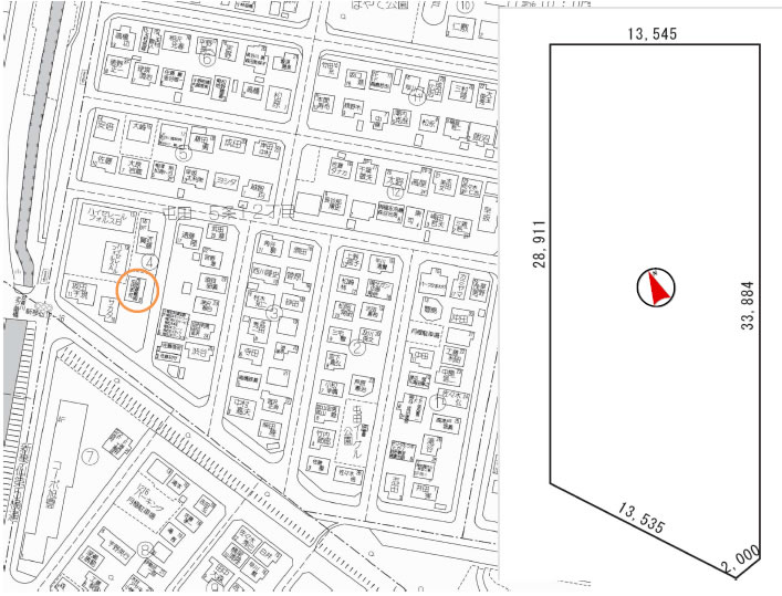 東側6m公道に約34m、角切2m、南西側14.54m公道に約14m接している。 |