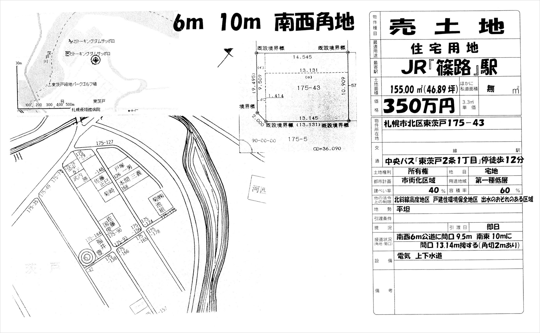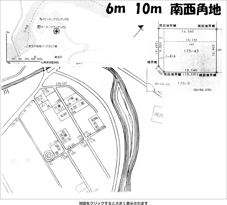南西6m公道に間口9.5m 南東10mに間口13.14m接する(角切2mあり) |